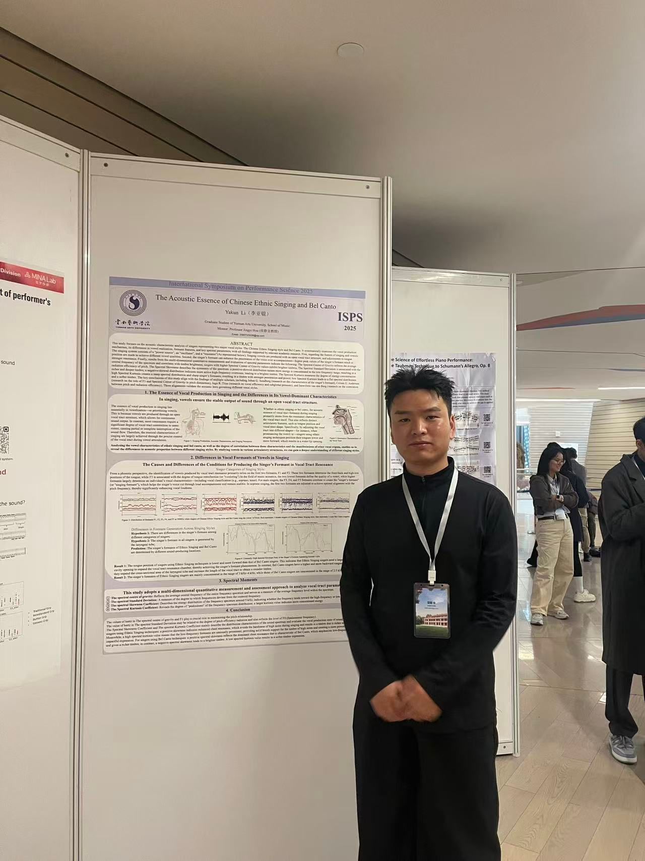 2025年10月29日—11月1日,第十届表演科学国际研讨会(ISPS 2025)在上海音乐学院举办。作为全球音乐表演研究领域的盛会,本次会议首次登陆中国,吸引了来自五大洲30多个国家和地区的200余位学者、演奏家与教育家齐聚一堂,共话“实践中的表演科学”。音乐学院硕士研究生李亚锟围绕《The acoustic essence of Chinese ethnic singing and bel canto》(《中国民族唱法与美声唱法的声学本质》)的核心研究内容,整理形成的研究海报成功入选大会海报展演。指导教师为侯静宜教授。