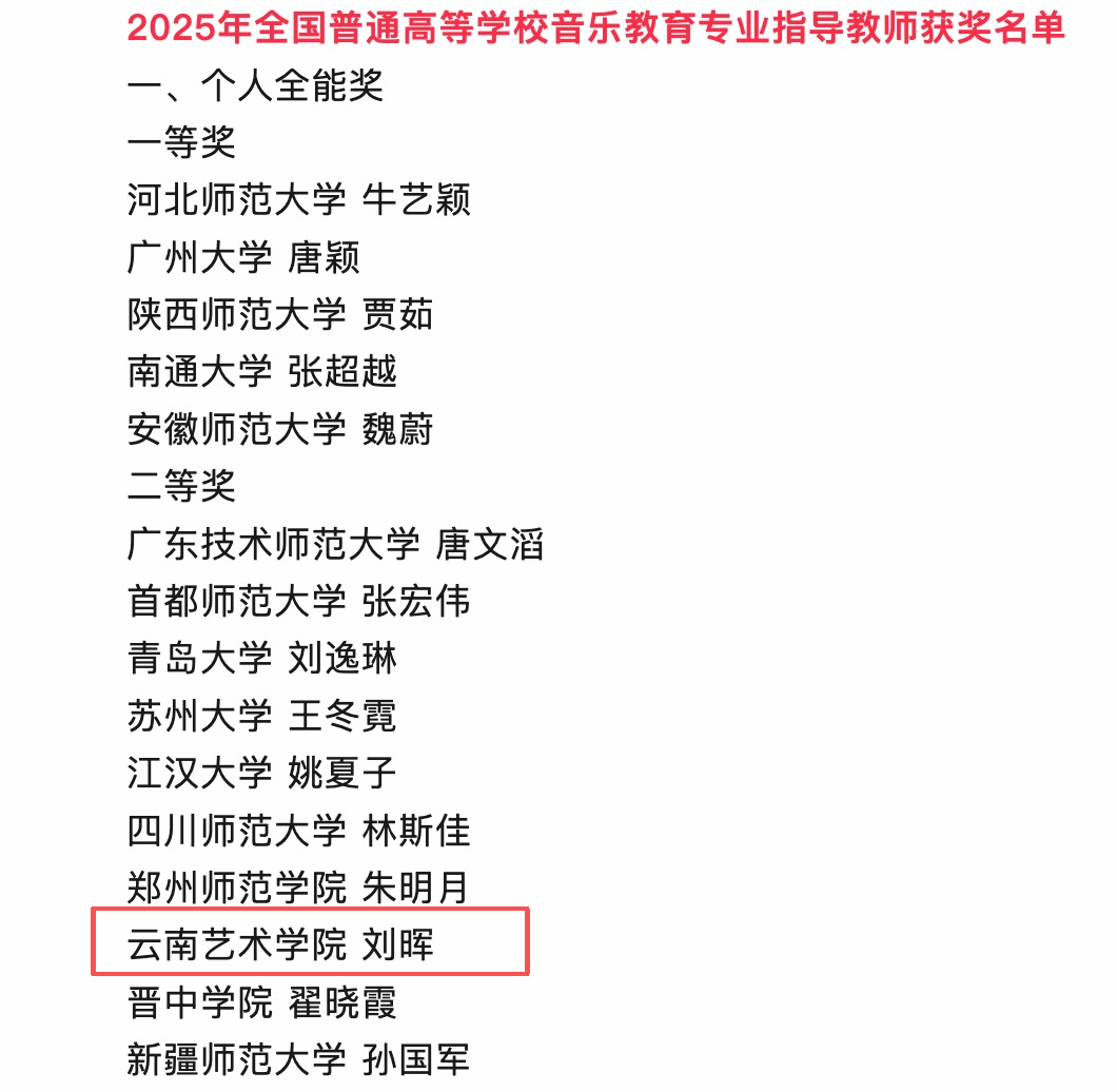 近日,教育部2025年全国普通高等学校音乐教育专业本科学生和教师基本功展示评选结果公示,beat365在线唯一官网登录音乐学院刘晖副教授获个人全能二等奖、审美和人文素养展示(经典音乐作品赏析)单项奖。