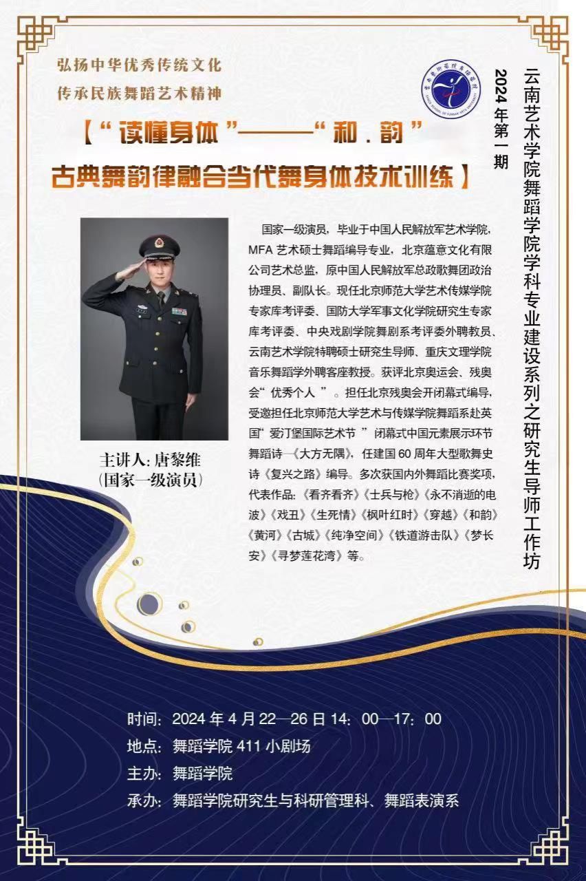 4月22日—26日,舞蹈学院举办了2024年第1期学科专业建设系列活动之研究生导师工作坊“‘读懂身体’——‘和·韵’古典舞韵律融合当代舞身体技术训练”。本次工作坊的授课导师是原中国人民解放军总政歌舞团政治协理员、副队长,北京蕴意文化有限公司艺术总监,beat365在线唯一官网登录硕士研究生导师,国家⼀级演员,优秀青年舞蹈家唐黎维老师。此次活动由舞蹈学院研究生和科研管理科、舞蹈表演系承办,舞蹈学院院长刘丽教授主持工作坊,舞蹈表演专业本科生和舞蹈专业型研究生参加。