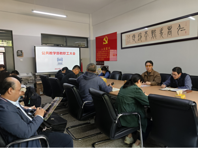 公共教学部于2024年4月9日召开全体教职工大会,持续推进本科教育教学审核评估工作的落实。公共教学部全体教职工参加会议,公共教学部主任杨祝飞主持会议。