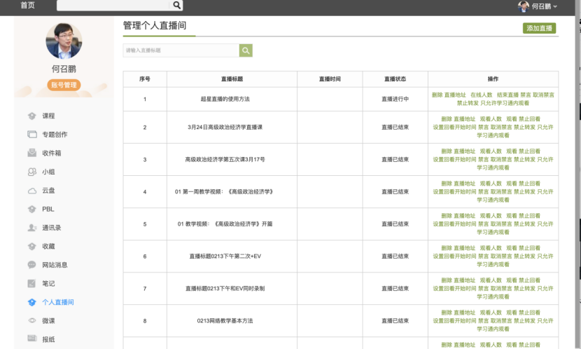 直播地址的获取需要登陆“超星泛雅平台”(网络地址:http://cufe.fanya.chaoxing.com/portal),登陆后进入教学空间,点击左下方个人直播间,你会发现刚刚创建的直播间“超星直播的使用方法”处在列表最上方,并且直播状态显示“直播进行中”: