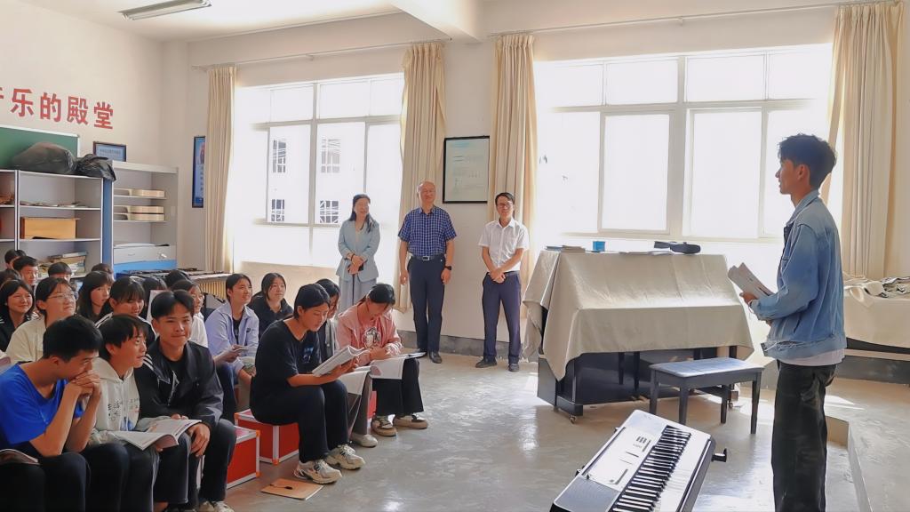 16日上午,在富宁县第一中学举行调研座谈会。会上,富宁县有关同志介绍了教育发展和美育开展情况,提出了希望beat365在线唯一官网登录帮扶事宜。我校教务处副处长罗宇佳对第二轮美育浸润行动计划的工作目标、重点任务、进展等情况做了汇报。我校派驻富宁县师生代表林恬、张颜分别做工作学习情况汇报。