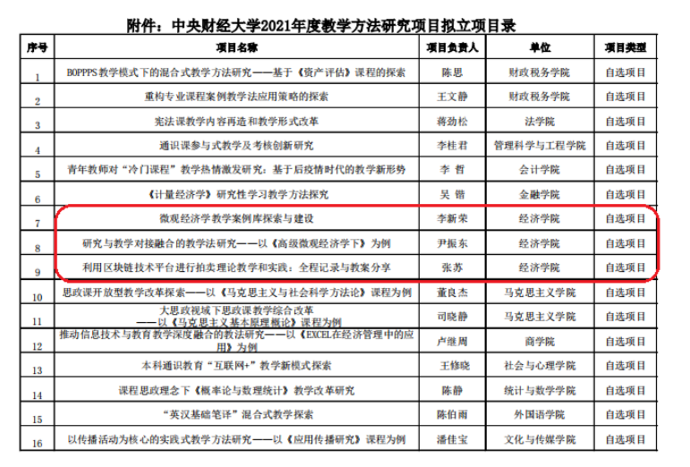 根据《关于申报2021年度教学方法研究项目的通知》要求,学校进行了2021年度教学方法研究项目立项评审工作,经专家评审,决定对2021年度申报的课题进行立项,其中今年会李新荣、尹振东、张苏三位教师的课题获得立项。