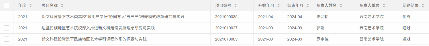 近日,教育部办公厅印发《教育部办公厅关于公布新文科研究与改革实践项目结题验收结果的通知》(教高厅函〔2026〕2号),我校承担的“新文科背景下艺术类高校‘政用产学研’协同育人‘五三三’培养模式改革研究与实践”“边疆民族地区艺术院校深入推进新文科建设发展理念研究与实践”“新文科建设背景下民族地区艺术学科课程体系的探索与实践”等3项国家级新文科研究与改革实践项目均顺利完成建设任务,通过结题验收,其中1项获评“优秀”等次,标志着学校在新文科专业建设和改革实践方面取得了阶段性重要突破。
