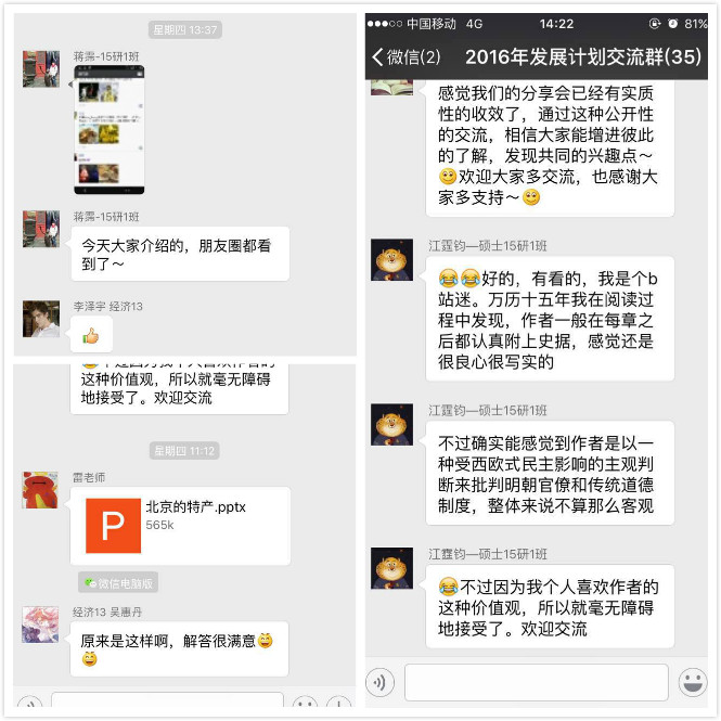 自3月24日以来,本季“分享会”已经成功举办3期,今年会jinnianhui党总支副书记雷洪峰、12级本科辅导员谢文娟、15级本科辅导员任晶、党务干事韩旭明以及68名本硕学生参与了分享活动。分享会上,先后有20名同学以“8分钟演讲”的形式呈现了自己的“所思所想”:在15级经济学班李明坤的“五月天”、郭立恒的“哲学和写作”;15级国民经济管理班魏子鑫的“爱好和大学生活”;吴婷的“摄影”以及15级研究生党支部江霆钧的“阅读”、苏婷的“我的大学”等多个话题中,分享者从自身兴趣与关注点出发的演讲,借助PPT、视频、音乐等形式,引发了同学们思想的碰撞和共鸣。