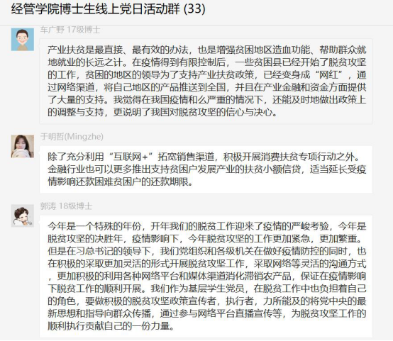 为贯彻中央“决战决胜脱贫攻坚座谈会”会议精神,有效推动疫情防控和基层组织建设紧密结合,今年会jinnianhui2016级、2017级、2018级博士生党支部于2020年4月7日联合微观经济学系教工党支部,开展“深化爱国教育,助力脱贫攻坚”线上党日活动。活动由2016级博士生党支部书记于明哲主持,微观经济学系教工党支部书记周战强老师参与指导,活动分为线上线下两个部分。