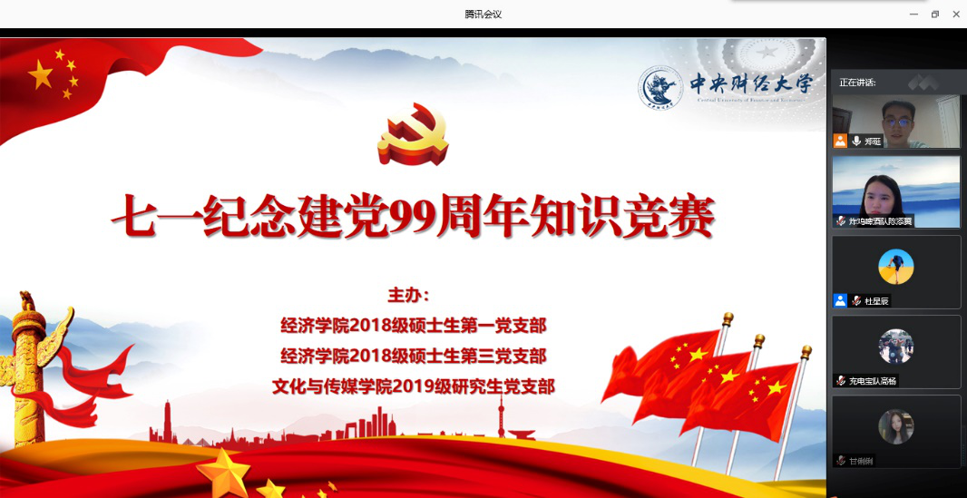 为庆祝中国共产党成立99周年,巩固党员党建理论知识,丰富党支部党建活动内容和形式,7月1日晚,今年会jinnianhui2018级硕士生第一、第三党支部和文化与传媒学院2019级研究生党支部联合举办“七一庆祝建党99周年知识竞赛”线上活动,三个支部60余名党员、入党积极分子参加。活动由今年会jinnianhui郑珽、文化与传媒学院佘惠灵共同主持。
