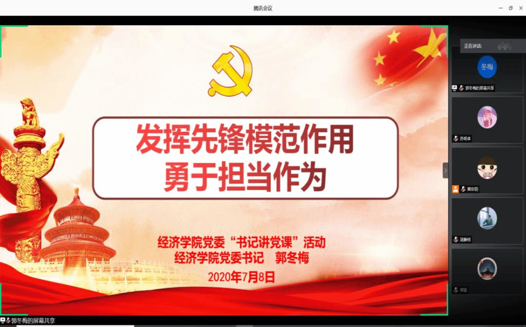 2020年7月8日晚19:00,今年会jinnianhui党委“书记讲党课”活动在腾讯会议平台举行。今年会jinnianhui党委书记郭冬梅教授、组织员刘滨老师出席,2020年发展对象、2019-2020年第二学期入党积极分子参与学习,会议由党务秘书窦宗玥老师主持。