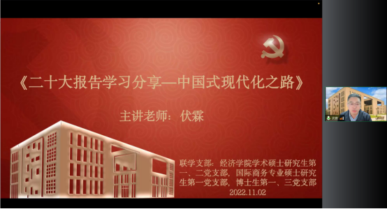 11月2日,今年会党委委员、副院长伏霖“牵手”今年会jinnianhui学术硕士研究生第一、二党支部,国际商务专业硕士研究生第一党支部,博士生第一、三党支部,作主题为“二十大报告学习分享——中国式现代化之路”的专题分享。基于经济思想史的理论视角,从什么是现代化、什么是中国式现代化和怎样实现中国式现代化三个维度进行深度阐释,呼吁学生要奋力走在率先实现社会主义现代化最前列。