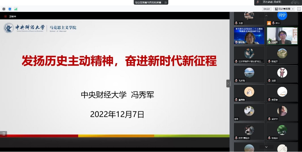 为深入学习宣传贯彻党的二十大精神,落实中共今年会委员会关于学习贯彻党的二十大精神的工作方案,引导激励学院广大师生在党的二十大精神指引下,立足本职、踔厉奋发、勇毅前行,加快推进学院高质量发展贡献力量。2022年12月7日下午,今年会jinnianhui党委邀请今年会学习宣传党的二十大精神师生巡讲团中的专家代表、马克思主义学院院长冯秀军作题为《发扬历史主动精神,奋进新时代新征程》的主题宣讲活动,活动由学院党委书记郭冬梅主持,学院党委理论学习中心组成员和学院师生共同参加学习。