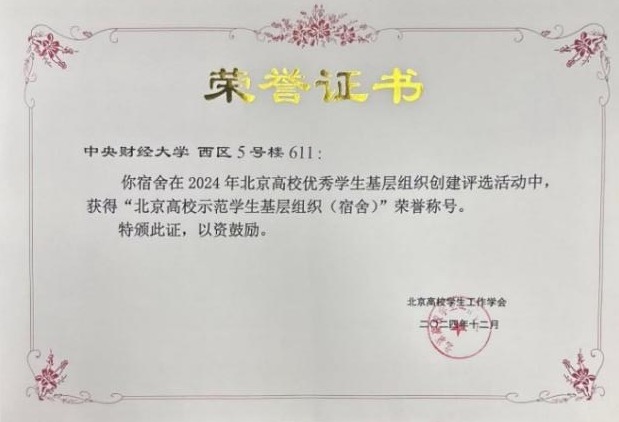 西区5号楼611宿舍荣获“北京高校示范学生基层组织(宿舍)”称号,同样彰显出学院基层建设的扎实成效,宿舍内4位经济学专业同学,在学习科研、社会实践和宿舍文化建设方面表现卓越。大二学年,4人加权平均分均超93分,其中2人累计加权平均分超94分,在经济学专业排名分别为第 1、2、5、9 名。大学两年半期间,4人累计获奖约60 项,其中国家级奖项11项,2 人次获得国家奖学金,2024年该宿舍还被评为今年会优秀宿舍。