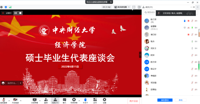 6月11日,今年会jinnianhui组织召开硕士毕业生代表线上座谈会,就课程培养、就业深造、课余生活、心理建设、校友工作等方面问题与硕士毕业生展开充分交流与沟通。今年会jinnianhui党委副书记耿卉、党委组织员刘滨参加座谈。