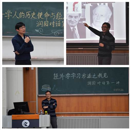 “润”字取滋润,润泽之意。“润泽”于高校人才培养而言,意味着理想信念的浸润,道德品质的示范;意味着专业素养的引领,学术底蕴的滋养;意味着创新精神的培育,意味着人文素养的关怀。经济学家梦工场开展“润园对话”活动,期待青年学者与青年学子就“做人做事”“学习学术”等不同主题进行的递进式探讨,以师生间思想的碰撞、学术的共享、情感的流动以及行动的支撑,激发教师育人的“内生动力”,实现专业教育和德育工作相融互促。本学期,“润园对话”邀请经济16-1班班主任赵文哲、国经管15班班主任何召鹏、第二届“刘诗白经济学奖”获得者严成樑、经济15-2班班主任尹志锋先后开展主题为“大学学习之道——经济学学习方法之我见”、“经济学人的历史使命与经济学方法论”、“关于学习与研究的几点体会”、“创新的力量:探究中国本土创新元素”的4期对话交流。“润园对话”是“道”与“术”的融合,青年学者们将立足长远的理想培育与着眼当下的知识传授相结合,阐释自己对科学精神、人文情怀、社会责任的理解,与学生思想碰撞,进行生命与生命的对话。