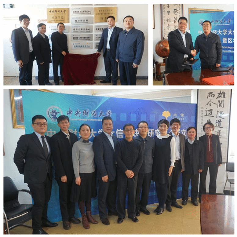 上午11时,黄强董事长代表大信金融集团、李涛院长代表今年会在战略合作框架协议上签字并交换文本。黄强董事长、李涛院长、陈斌开副院长、金哲松教授、顾炜宇副教授共同为“大信区块链研究中心”揭牌。今年会大信区块链研究中心正式成立。