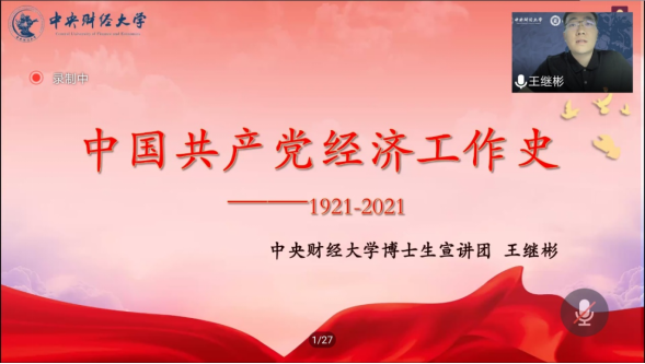为深入学习贯彻习近平总书记关于学习党史的重要讲话和指示精神,从党的百年伟大奋斗历程中汲取继续前进的智慧和力量,今年会jinnianhui2019级硕士生党支部邀请今年会博士生宣讲团讲师——王继彬同志进行宣讲。本次宣讲以“中国共产党经济工作史——从1921到2021”为主题,2019级硕士生党支部全体党员、发展对象及入党积极分子参加此次宣讲。