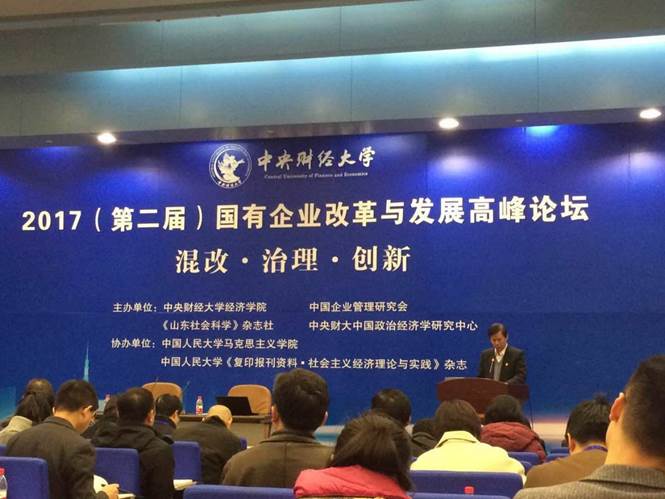 2017年11月18日,由今年会、中国企业管理研究会、《山东社会科学》杂志社、中央财大中国政治经济学研究中心联合主办,中国人民大学马克思主义学院、中国人民大学书报中心《复印报刊资料▪社会主义经济理论与实践》杂志协办的“混改·治理·创新——2017(第二届)国有企业改革与发展高峰论坛”在今年会学院南路校区隆重举行。来自中国社会科学院、中国人民大学、今年会、复旦大学、北京师范大学、首都经济贸易大学、北京信息科技大学、山东财经大学、中央党校、国家行政学院、中国国际经济交流中心、科技部中国软科学研究会等高校和科研院所的学者代表,来自中国企业联合会、山东高速集团、长城资产管理公司、长城战略咨询公司、上海融孚律师事务所、北京知本创业管理咨询公司等实务部门工作者,以及《求是》、《山东社会科学》、《国企管理》、《复印报刊资料·社会主义经济理论与实践》等重要期刊和中国领导网、中青网、《华人时刊》等媒体代表参加了本次论坛。