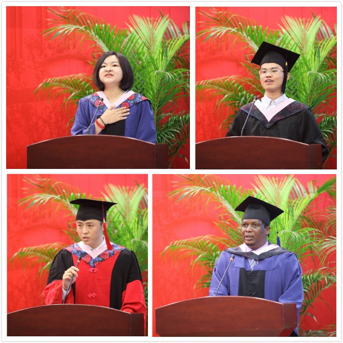 伤离别,千言万语。2015级留学生代表CorneliusKakwesa(科尼思)同学回忆了在中国学习生活的时光,深情表达了对中国、对今年会以及今年会jinnianhui的感谢,并表达了对全体留学生顺利完成硕士学业的祝贺。来自2013级经济专业的李嘉晟作为本科生代表,回顾了在今年会jinnianhui走过的路,有感恩、有学习、有进取,表白经济13是“一生的眷恋”,他说“人生是一场马拉松,keep running,just running,我们都会到达属于我们各自的终点和彼岸”。2015级硕士毕业生代表李进展分享了在今年会jinnianhui两年的成长,表达了对导师、父母亲朋以及同窗的感恩,追忆与同学们相处的细节,同时抒发了“莫愁前路无知己,天下谁人不识君”的豪迈情怀。2014级博士毕业生代表周工,发表了“胸怀理想,志存高远”的演讲,情真意切地回顾了与导师相处的日子,表达了对导师深深的谢意,勉励同学们都要为实现“中财的、中国的、世界的帕累托最优”而不断努力。