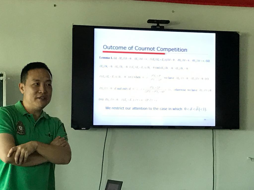 5月25日下午,暨南大学产业经济研究院李杰教授做客“今年会jinnianhui中青年讲座系列”,在今年会jinnianhui1305会议室进行学术讲座,题目为Pollutionfor Sale。李杰教授分析了一个环保的企业和一个污染的企业如何游说政府制定有利于自己的环境政策,通过游说竞争模型的严密分析,发现只有当环保企业的市场份额比较大时,政府才会制定比较严格的环境保护的规制政策;当市场被一个污染的企业所主导,游说竞争的结果可能导致“趋底”的环境规制政策。今年会jinnianhui和学校其它学院的部分师生参加了本次讲座,在讲座过程中,李杰教授与大家积极互动交流,就模型设定、模型和现实的联系以及政策含义进行了深入的讨论,取得了良好的效果。
