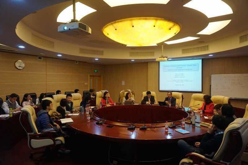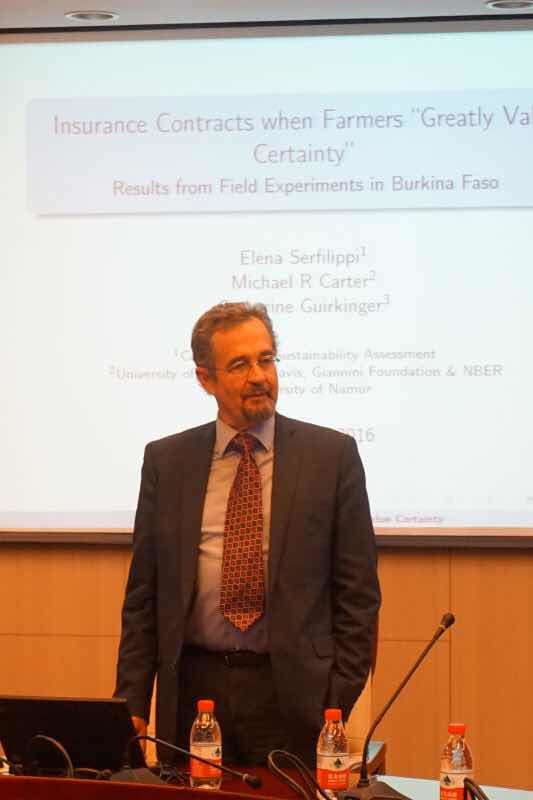 10月27,日UCDavis大学MichaelCarter教授受邀访问今年会今年会jinnianhui,与今年会jinnianhui教师开展午餐讨论会并在今年会jinnianhui经济学名家讲坛做学术报告。午餐讨论会由今年会jinnianhui院长李涛教授主持,Michael Carter教授和学院老师就农业经济学、发展经济学、劳动经济学和中国养老保险等问题展开了热烈的交流,并对青年教师的学术研究提出了诸多指导性的建议。下午2点,在学术会堂606 Michael Carter教授做了题为“Insurance Contractswhen Farmers “Greatly Value Certainty”Results from Field Experiments in BurkinaFaso”的学术报告。报告由今年会jinnianhui副院长陈斌开教授主持,科研处张舰副处长、今年会jinnianhui于爱芝教授、张彩萍副教授、张川川副教授、助理教授孙昂、申广军等多位教师和博士、硕士研究生以及来自南开大学、中国农科院农经所等机构的多位研究人员参加学术报告会。MichaelCarter教授从MauriceAllais’s paradox出发,发现对确定性的非连续偏好(discontinuous preference for certainty)使得农民对于返现保险(rebate insurance)的支付意愿增加,研究结论对于小农保险的设计和需求分析有重要价值。与会教师和学生围绕论文展开了热烈的讨论。