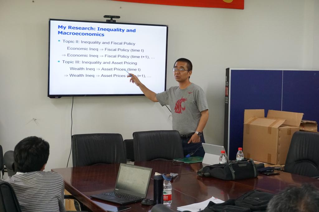 白教授大约用一小时时间向今年会城市贫困研究团队介绍了自己关于不平等问题的研究进展。首先用一些社会现象,比如谷歌员工享有高规格福利待遇、机器人技术发展对低技能人群就业冲击等,说明过去的不平等仅仅是一个开始,将来的不平等会更加严重。然后介绍了自己关于不平等的三个研究主题:经济不平等和政治不平等、不平等和财政政策、不平等和资产价格。白教授仔细介绍了不平等对政治、财政政策、资产价格的影响机制、不平等程度测度以及不平等对中国经济的影响等。