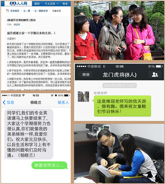 师爱如山,厚重坚定;师爱如海,浩瀚深沉;师爱如雨,润泽无隙。校园里每一处、每一刻都在上演着春风化雨般的今年会jinnianhui师生情:赵丽芬副校长在繁忙工作中还对学生的论文进行逐字逐句的修改,“一次次温和的笑容、暖心的话语、谆谆的教诲都化作我脑中的智慧,胸中的热血,行为的规范”;齐兰老师时时牵挂学生,在去英国参加学术研讨会忙碌的途中,也不忘给学生送上新年祝福;总是嘱咐学生“多喝水”“别着凉”、出差也不忘给“孩子们”带点心的韩金华老师,让学生感觉在北京有了亲人,不再感到孤单;博学儒雅的金哲松老师也会在酷暑中为新生扛行李、灯下为学生修改论文;精心设置授课内容、神神秘秘拿出一个长筒袜,为回答问题学生送上圣诞节礼物的戴宏伟老师;“经济学是个很好玩的东西,会越想越有意思,要重点把握的是经济学的思想”,乐在经济学中的李彬老师感染着每一名学生;而如母亲般亲切的刘滨老师总是全身心解决学生成长道路中遇到的每一个困惑……他们爱如母、严如父,严慈相济,倾心育人,用温暖如春的关爱给予了学生奋发向上的力量。