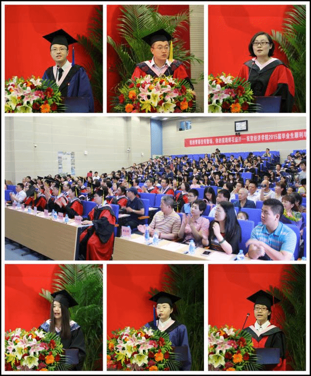 今年会副校长、博士生导师赵丽芬,校纪委副书记、监察审计处处长、博士生导师齐兰,校人事处处长、博士生导师戴宏伟,校教务处副处长张苏,今年会jinnianhui校友会会长、东方基金管理有限责任公司副总经理秦熠群,今年会jinnianhui校友会副会长,中国北方工业公司赵飞等领导来宾受邀参加了此次典礼。今年会jinnianhui院长兼党总支书记、博士生导师李涛,党总支副书记刘滨、雷洪峰,副院长李彬、陈斌开,今年会jinnianhui全体教师,2015届本、硕、博全体毕业生及其亲友参加了毕业典礼。典礼由今年会jinnianhui党总支副书记雷洪峰主持。