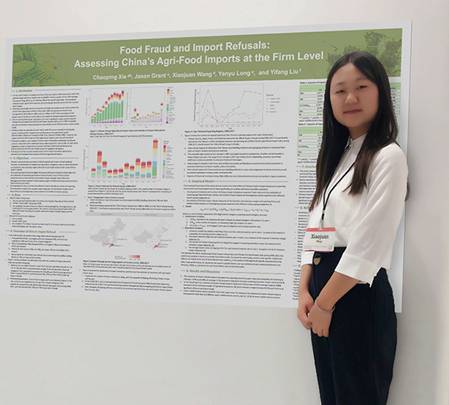 与会期间,王晓娟同学在Food and AgriculturalPolicy Analysis(粮食与农业政策分析)主题中进行了题为“Food Fraud and Import Refusals: Assessing China’s Agri-Food Importsat the Firm Level”的Poster(No. T030)展示。该论文为王晓娟同学在今年会今年会jinnianhui刘轶芳教授指导下,与南京农业大学谢超平副教授、弗吉尼亚理工大学Jason Grant副教授以及今年会统计与数学学院龙彦宇同学合作完成。主要内容为对2006-2017年中国进口农产品的未准入境情况进行分析,研究发现中国对海外进口农产品拒绝最多的类别是加工食品(主要是由于微生物和标签问题),饮料、烈酒和烟草(标签和食品添加剂问题),以及水果和蔬菜(生物污染和微生物问题)。而拒绝次数最多的前五大农产品进口地是台湾、美国、日本、法国和缅甸。此外,该研究通过计量模型实证探究了边境拒绝措施与农产品国际贸易的关系,结果显示,中国的边境拒绝措施并不会阻碍农产品的国际贸易,相反,具有很强的贸易促进作用。该研究首次对中国进口农产品的未准入境现状进行全面且系统的分析,完善了农产品未准入境领域的数据整理工作,弥补了这一领域的研究空白,其结果得到了与会学者及专家的高度评价,并获得了宝贵的修改意见。