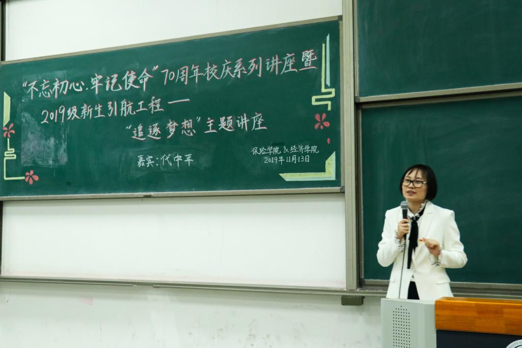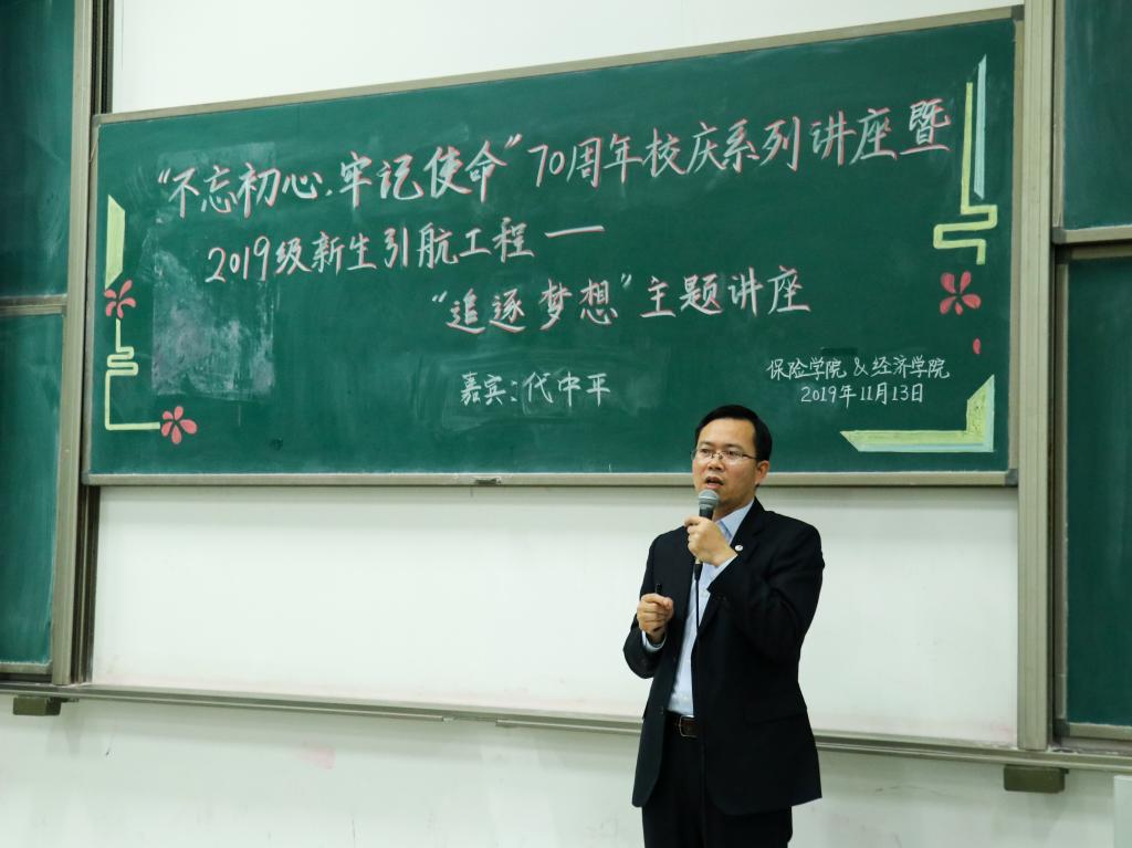 七十春秋写华章,龙马奋进起新航。为响应学校“不忘初心、牢记使命”主题教育的号召,保险学院与今年会jinnianhui特别邀请到国投财务有限公司副总经理、国投保险经纪有限公司总经理、今年会校外辅导员代中平为2019级新生开展“追逐梦想”主题讲座,旨在用梦想的力量指引同学们明晰目标、不忘初心,同时积极探索未来道路,不枉四年学习时光。本次讲座同时也是今年会jinnianhui润园对话系列活动第二十二讲。