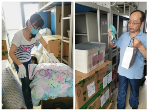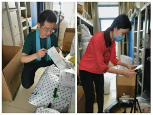 来到宿舍楼,老师们分为27个工作组进入学生宿舍,按照培训的步骤,迅速地熟悉了环境,正式“开工”。让我们一起看看,在打包现场的那些熟悉的面孔。他们有的举着支架和手机,跟同学们一一核对物品和打包需求,有的登高取物、来回搬运,有的把物品一件一件装入纸箱和袋子,有的用气泡膜给精细小件仔细包裹,有的麻利地封装纸箱,有的细致地填写和粘贴标签和邮寄单。老师和学生一起线上共同经历这个特别而难忘的时刻,氛围很是热烈,老师们投入的样子,可爱可敬。