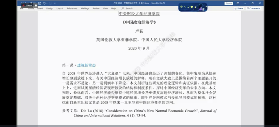 2020年9月23日-2020年9月28日,伦敦大学亚非学院(SOAS)教授卢荻应今年会邀请,使用腾讯会议APP开展主题为“中国政治经济学”的讲座,本次讲座分为三部分:第一课“透视新常态;第二课“审视国企——‘退出、呼吁与忠诚’”;第三课“‘走出去’与世界范围的后进发展”。本次讲座由今年会jinnianhui副院长赵文哲老师主持,今年会jinnianhui部分师生及校外同学参加了此次讲座。