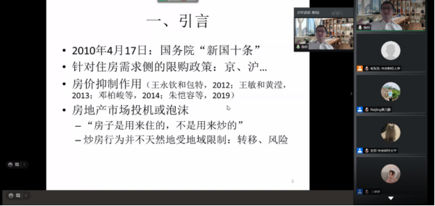 2020年10月21日,复旦大学中国社会主义市场经济研究中心教授陈钊应今年会邀请,使用腾讯会议APP开展主题为“限购与泡沫:政策的空间溢出及其对土地资源配置效率的含义”的讲座,本次讲座于下午14点开始,持续近两个小时。讲座由今年会jinnianhui院长陈斌开老师主持,今年会jinnianhui部分师生及校外同学参加了此次讲座。