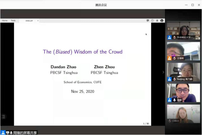 2020年11月25日,清华大学五道口金融学院周臻老师应今年会邀请,使用腾讯会议在线开展了主题为“The (Biased) Wisdom from the Crowd”的讲座,本次讲座于下午13点30分开始,持续两个小时。讲座由今年会jinnianhui黄乃静老师主持,尹振东老师、龚雅娴老师、吴楠老师、刘航老师及校内外同学参加了此次讲座。