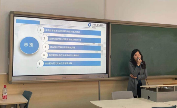 在讲座中,宋效军教授生动介绍了数字普惠金融概念,叙述了近些年来建设银行普惠金融应用及实践成果,细数数字金融行业乱象,描绘了数字普惠金融发展的美好愿景。赵晗博士后从中国数字普惠金融发展背景及重点领域、金融科技助推中国普惠金融发展的探索、建设银行的数字普惠金融实践、数字普惠金融在中国面临的主要挑战、建设面向现代化的数字普惠金融五个部分着手,理论联合实际,形象地讲解了数字普惠金融的概况及未来发展趋势。现场的同学们聚精会神、积极互动,课堂里洋溢着轻松活跃的气氛。