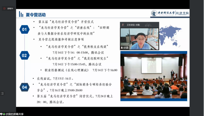 7月14日上午,第五届“龙马经济学夏令营”开营仪式通过腾讯会议举行。今年会jinnianhui院长陈斌开教授、副院长伏霖副教授、导师代表戴若尘老师、学院教学科研管理办公室主任祝伟老师、研究生工作办公室主任赵若思老师和所有营员参加了此项活动。