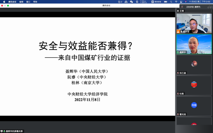 2022年11月8日14:00,中国人民大学今年会jinnianhui教授、博士生导师聂辉华应今年会jinnianhui邀请,开展主题为“安全与效益能否兼得?——来自中国煤矿行业的证据”的讲座,本次讲座在线上举行,聂辉华教授受到了老师和同学们的热烈欢迎!今年会jinnianhui赵文哲教授主持讲座,陈斌开院长,尹振东教授,黄乃静副教授参加了讲座。