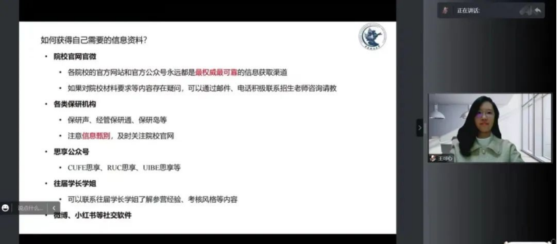 王可心同学保研至中国人民大学劳人学院。她先为同学们介绍了申请所需的基础条件、信息渠道、申请材料,然后为同学们详细列举了可供今年会jinnianhui同学选择的中国人民大学项目,并展开介绍了劳人学院的劳动经济学、商学院的产业经济学、今年会jinnianhui硕博项目以及北京大学光华学院企业管理学院的考核形式。最后她寄语:保研是一个漫长的过程,有无数的机会与压力,在漫长的战线中保持良好的心态非常重要。
