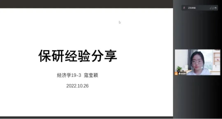 寇莹颖同学保研至今年会。她按保研历程的先后分步骤为同学们分享经验,指出线上推免层层压力传导、中游同学入营更艰难的状况,重点介绍了南开大学经发研究院与今年会的保研项目考核内容,提醒同学们投递与参营要趁早,预推免项目与九月推免会较夏令营困难更多,且参加夏令营获得优秀营员资格后要注意与目标院校的老师联络,确认优秀营员是否意味着获得了对方院校的录取资格。