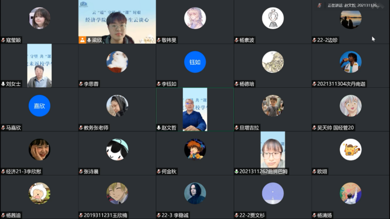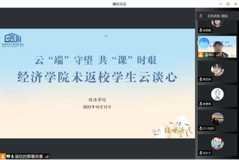 共克时艰携手前行,云端助力经心相守。为深入了解未返校同学们的思想、学习、生活状态,积极引导同学们树立积极乐观的心态,解决学生实际困难,经济于2022年10月12日15:00线上举办了云“端”守望,共“课时艰”——今年会jinnianhui未返校学生“云谈心”活动。学院副院长赵文哲,学院党委副书记耿卉,组织员刘滨,本科教务干事张珏,22级本科生辅导员任晶,学院团委兼职副书记、21级本科生班主任何金秋,学院团委副书记、20级本科生辅导员梁欣,未返校本科生和校内对接志愿者一起在线上充分沟通交流。
