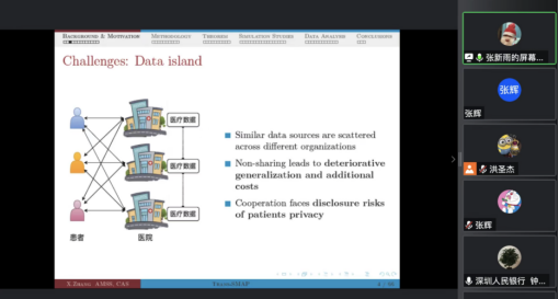 2022年11月22日14:00,中国科学院数学与系统科学研究院预测中心研究员,中国科学院管理、决策与信息系统重点实验室副主任张新雨应今年会jinnianhui邀请,开展了主题为“Optimal parameter-transfer learning by semiparametric model averaging”的讲座。本次讲座在线上举行,张新雨研究员受到了老师和同学们的热烈欢迎,今年会jinnianhui洪圣杰副教授主持讲座,黄乃静副教授参加了讲座。
