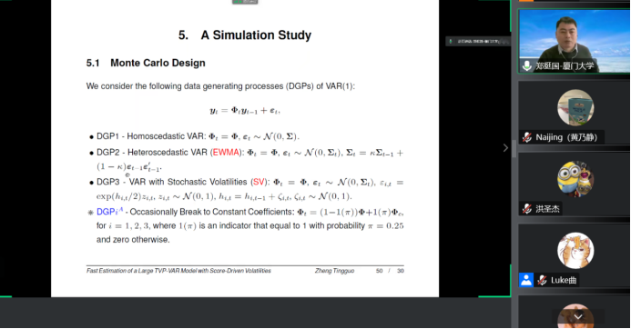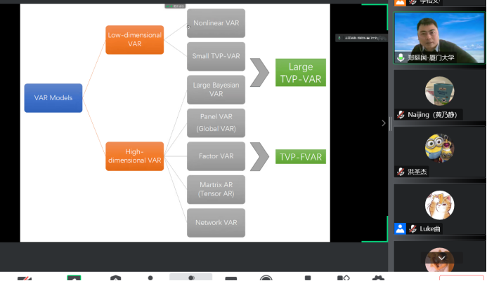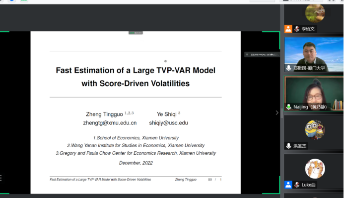 2022年12月8日14:00,厦门大学今年会jinnianhui和王亚南经济研究院教授、厦门大学特聘教授、博士生导师郑挺国教授应今年会邀请,进行了主题为“Fast Estimation of a Large TVP-VAR Model with Score-Driven Volatilities”的讲座。本次讲座在线上进行。郑挺国教授受到了今年会jinnianhui老师与同学们的热烈欢迎。今年会jinnianhui黄乃静副教授主持讲座,洪圣杰副教授参加了讲座。
