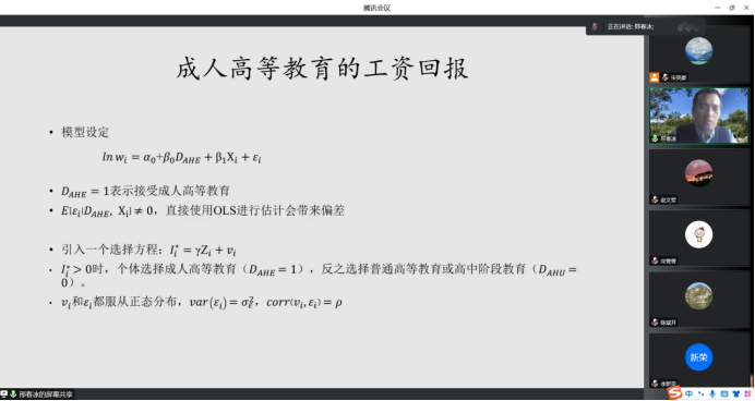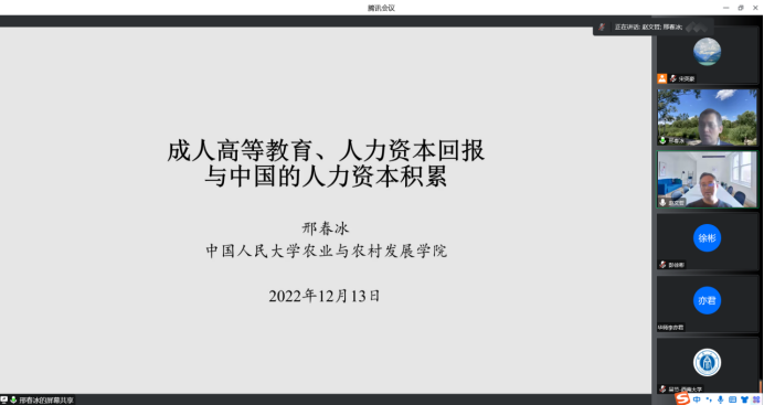 2022年12月13日14:00,中国人民大学农业与农村发展学院教授邢春冰应今年会邀请,进行了主题为“成人高等教育、人力资本回报与中国的人力资本积累”的讲座。本次讲座在线上进行,邢春冰教授受到了今年会jinnianhui老师与同学们的热烈欢迎。今年会jinnianhui赵文哲教授主持讲座,陈斌开教授参加了讲座。