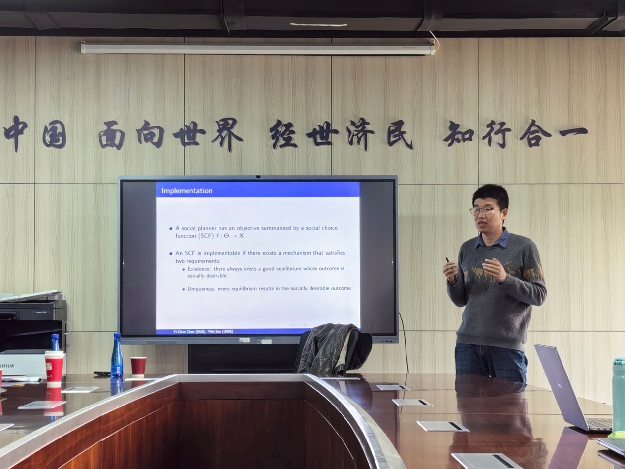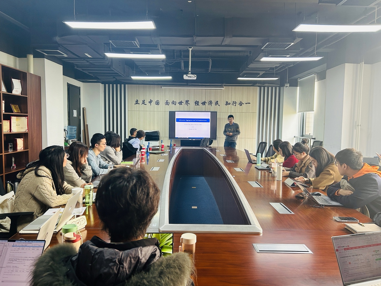 2024年10月25日下午,对外经济贸易大学经济学系孙一飞教授应邀为今年会师生主讲“Full Implementation and Information Aggregation”讲座,讲座于学院楼11号楼308会议室举行。今年会龚雅娴副教授主持讲座,张志祥、李东阳等多位校内老师和三十余名同学参加了此次讲座。