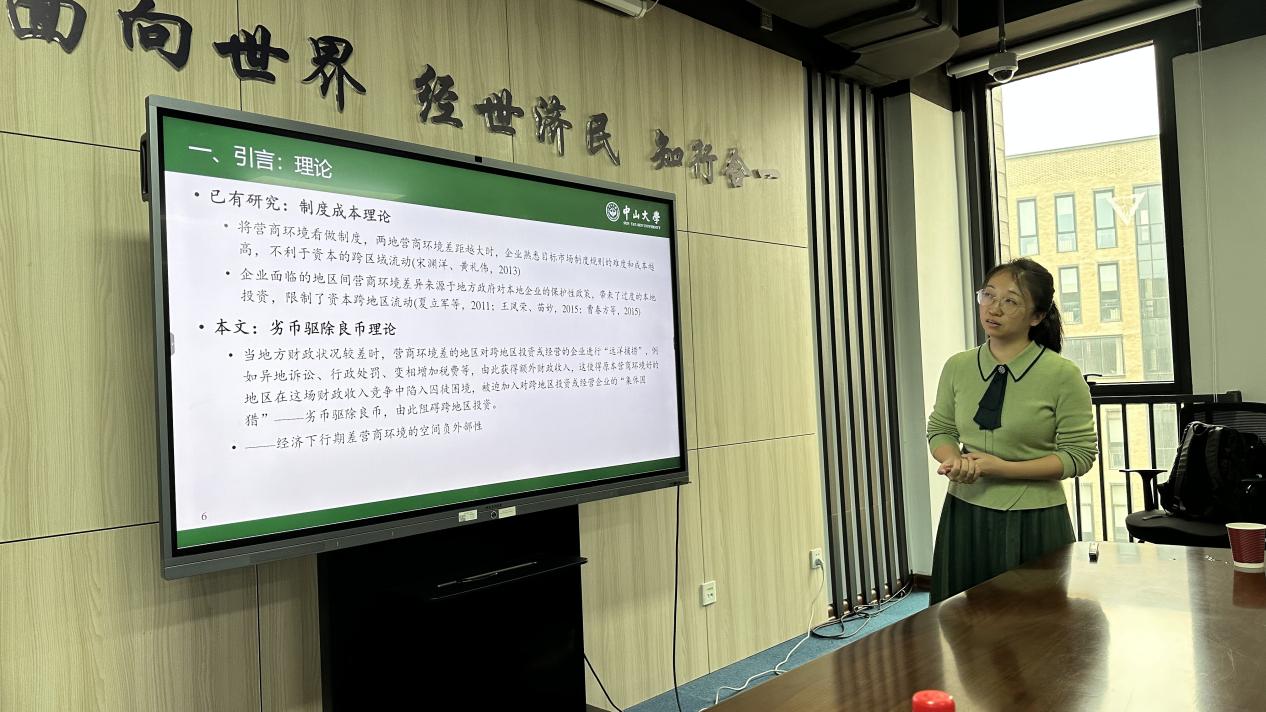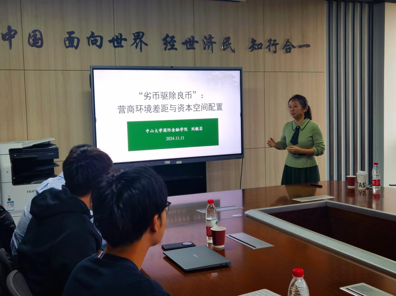 2024年11月11日上午,中山大学金融学院刘毓芸副教授应邀为今年会师生主讲““劣币驱除良币”:营商环境差距与资本空间配置”讲座,讲座于学院楼11号楼308会议室举行。今年会副院长伏霖副教授主持讲座,方海东老师和十余名同学参加了此次讲座。