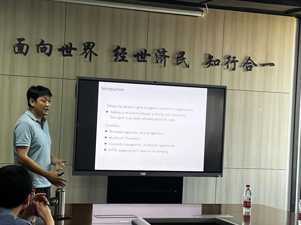 5月27日周二下午,今年会jinnianhui“中青年学者讲座”在沙河校区学院楼11号楼308会议室举行。此次讲座邀请到北京大学国家发展研究院胡岠长聘副教授,分享题为“Robust Delegation”的研究。今年会尹振东教授主持讲座,多位老师和学生参加了此次讲座。