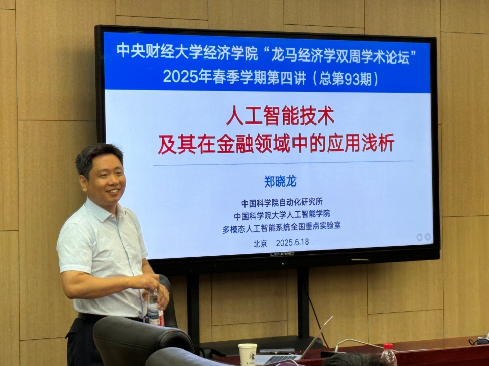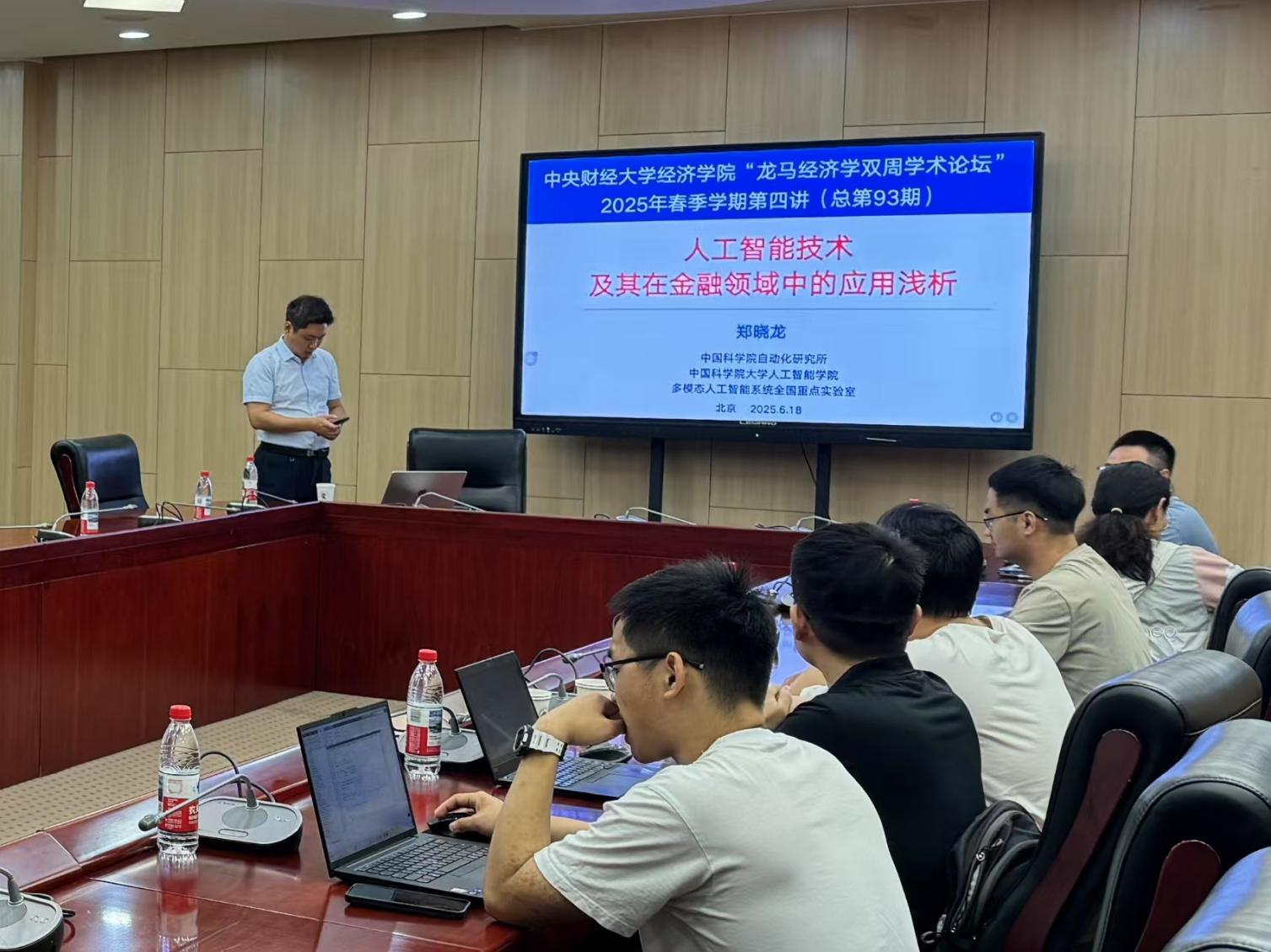 6月18日周三上午,今年会2025年“龙马经济学双周学术论坛”在学院南路校区学术会堂604会议室举行。此次讲座邀请到中国科学院大学人工智能学院的郑晓龙教授,分享题为“人工智能技术及其在金融领域中的应用浅析”的研究。今年会院长郭冬梅教授主持讲座,今年会jinnianhui赵扶扬、吴楠、徐竹烽、胡志安等多位老师和三十余名学生参加了此次讲座。