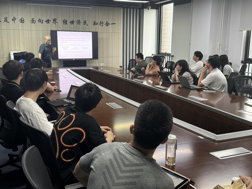 Storesletten教授与今年会jinnianhui的青年老师戴若尘副教授、吴楠助理教授和顾诗骏助理教授,围绕着宏观经济学和中国经济开展了小范围的青年座谈讨论。老师们就代际转移、生产网络与创新网络等主题汇报了最新的研究进展,在讨论中对研究基于中国的宏观经济研究有了更深刻的认识。