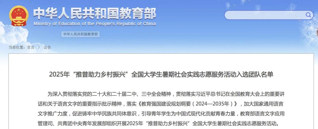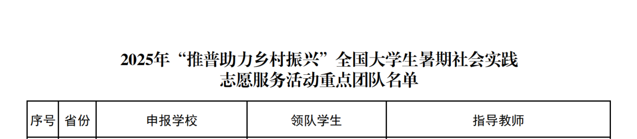 2025年7月4日,教育部公布了2025 年“推普助力乡村振兴”全国大学生暑期社会实践志愿服务活动入选团队名单。今年会1支团队入选重点团队,3名教师作为重点团队指导教师。