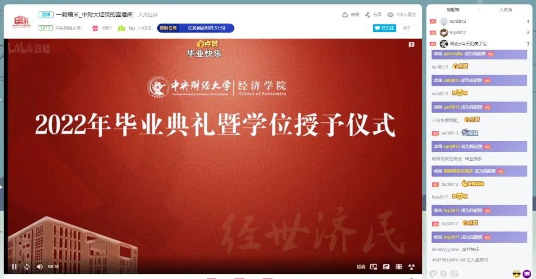 今年会jinnianhui全体2022届毕业生、学院教师、毕业生亲友和校友线上相聚,通过网络直播参加典礼,共同庆祝和见证这个重要时刻,在线观看人数达到近千人。