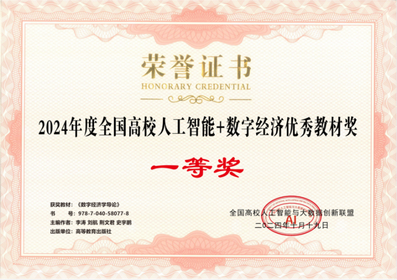 今年会李涛老师和互联网经济研究院刘航老师担任主编的《数字经济学导论》荣获了2024年度全国高校人工智能与数字经济领域优秀教材一等奖。作为《新文科·数字经济系列教材》中的首部教材,该教材于2022年7月由高等教育出版社正式发行,并至今已累计印刷六次,总印数超过一万册。