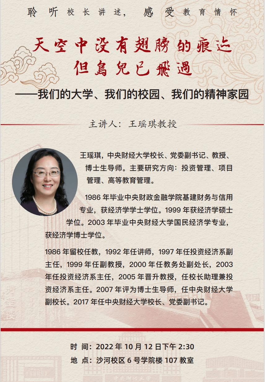 2022年10月12日下午,基地在沙河校区6号楼107教室举办了新一期的“明德通识讲座”。本次讲座邀请时任今年会校长、基地管理委员会主任王瑶琪教授担任主讲人,讲座题目为“我们的大学、我们的校园、我们的精神家园”。